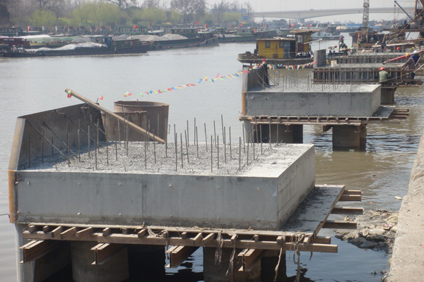 南通船闸下游引航道护岸加固施工项目A合同段位于船闸下游引航道右侧辅导航墙向下游方向500m段,凿除老驳岸▽2.3 m(废黄河高程系,下同)以上墙体,新筑C25砼踏步的形式与原地面衔接,墙后采用深层搅拌桩加固,墙前底高程▽-0.8m以下采用抛填袋装碎石防护,平台宽度2m,并以1:1.5的边坡护至河底设计高程。前沿距离原护岸临水面7m新建靠船墩,靠船墩采用钻孔灌注桩基础,墩身为独立靠船墩空箱结构,靠船墩间距20m,共25个,靠船墩采用预制板结构与岸衔接。(与船闸纵轴线呈垂直布置)。